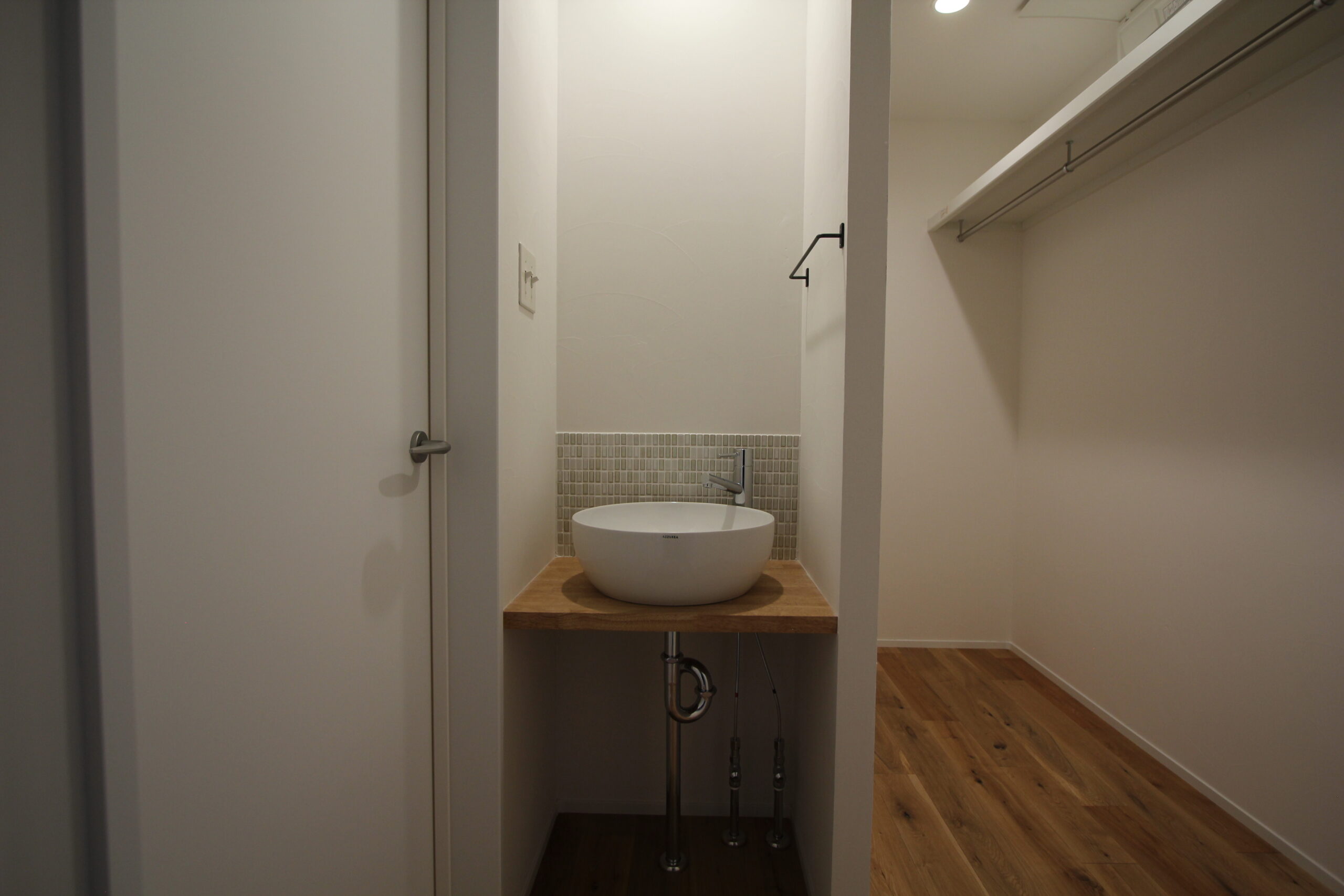 こだわりのあるキッチンと造作洗面台。階段上の吹抜部も収納へ有効活用しています。