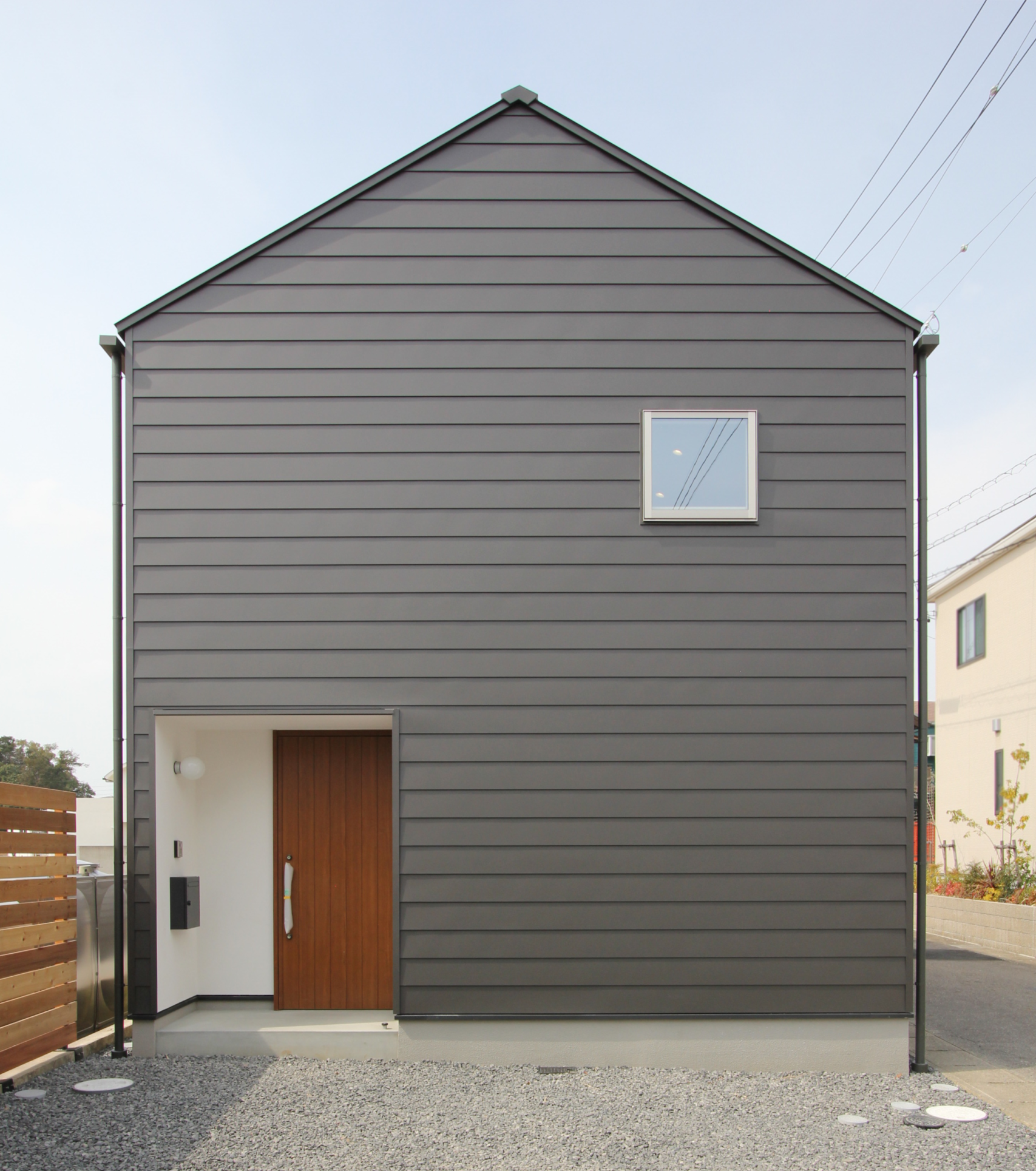 無垢フローリングや壁漆喰仕上げなど充実した建物仕様をシンプルな切妻屋根の中に納めました。
